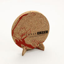 ノベルティーの大定番=コルクコースター、の2枚組セット商品です。ラックにコースターを立てて置けるのでとても便利で衛生的です。